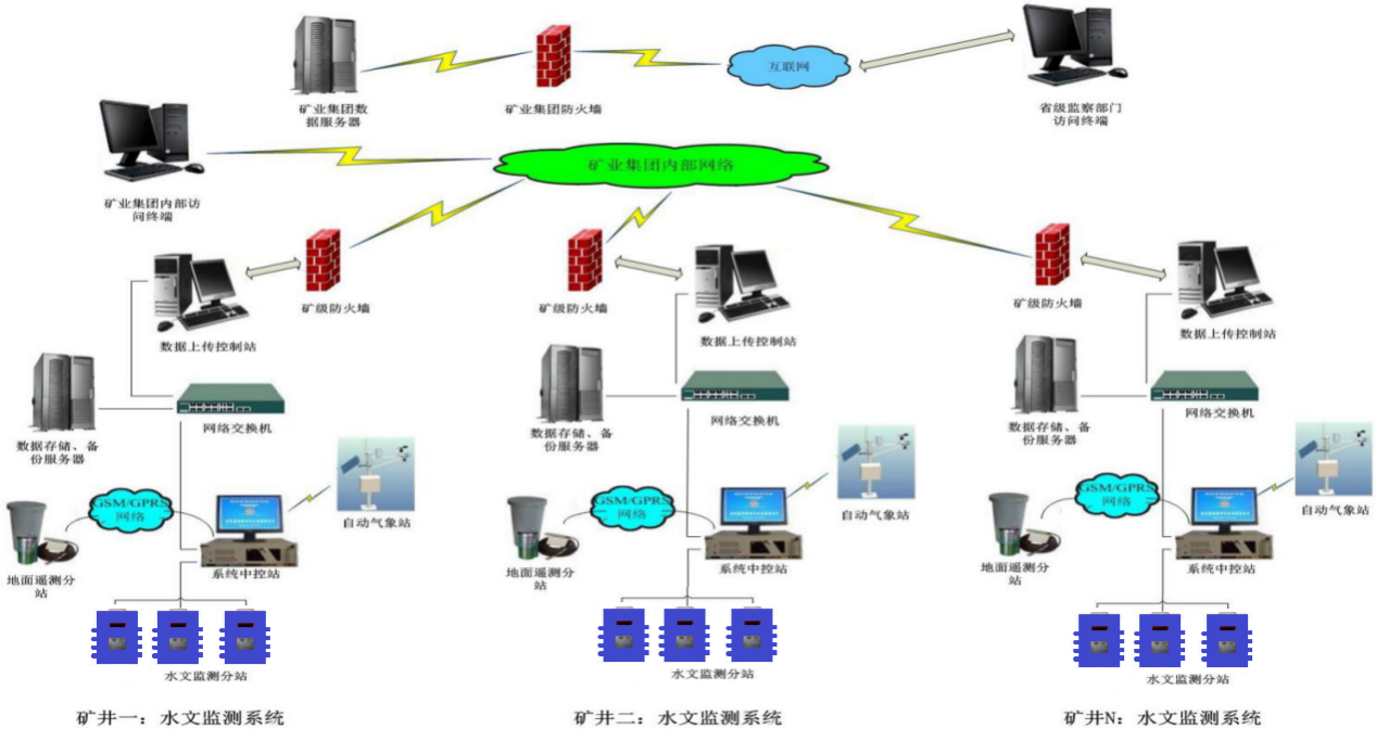 通过井下水文监测分站+工业以太网/专线将采集到的井下水文长观孔数据、明渠流量数据,管道压力数据,管道流量数据等各种水文实时数据按照设计的通信协议,将各观测点的水文数据传输、处理并存储到水文信息数据库中。
